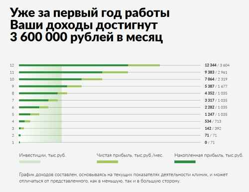 Вы инвестируете порядка 4 млн. рублей, которые окупятся уже через 8 месяцев. Дальнейшую прибыль можно реинвестировать в разработку новых услуг Вашего центра и закуп современного оборудования. Эффективность и эксклюзивность процедур обеспечит вас дополнительным заработком. Если мыслить глобальнее, вы можете открыть еще одну клинику, постепенно создавая собственную сеть.